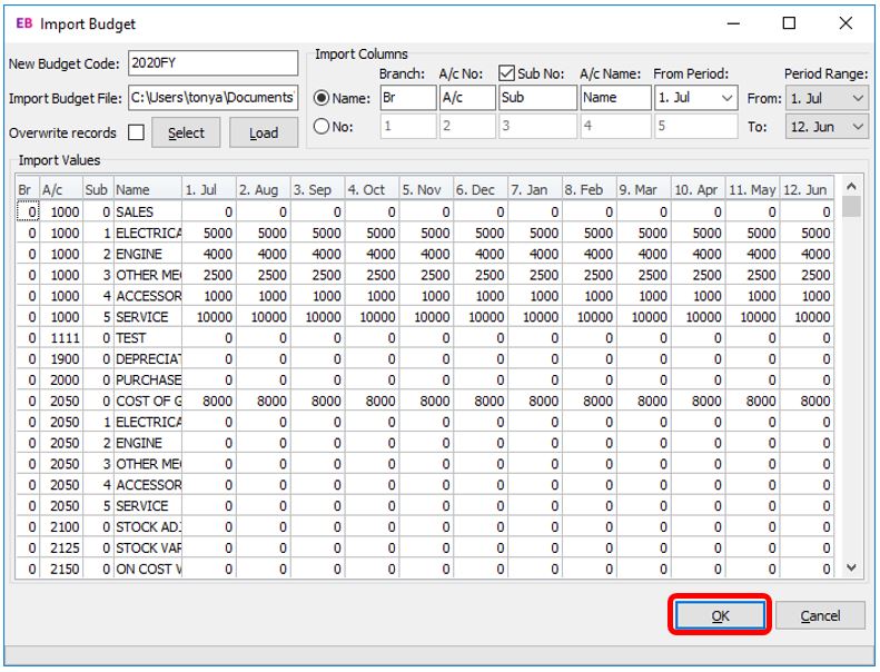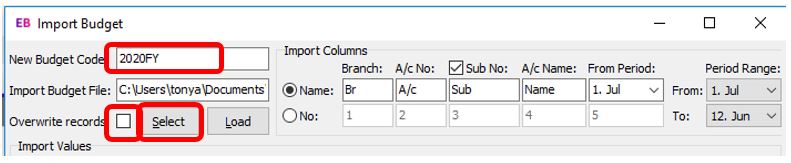 The “Load” button uploads the import file in to the screen (the same as what happens when you click “Select”) only it assumes the budget file name and location.