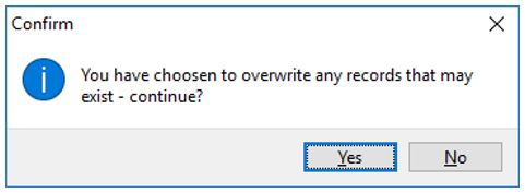 If you ticked to Overwrite records you will receive the following prompt. Click “Yes if that was your intention”.