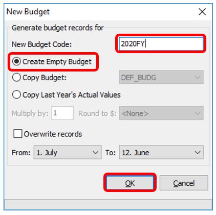 Enter a new budget code, select “Create Empty Budget” and then click “OK”. This will create a new budget with zero values for all accounts.