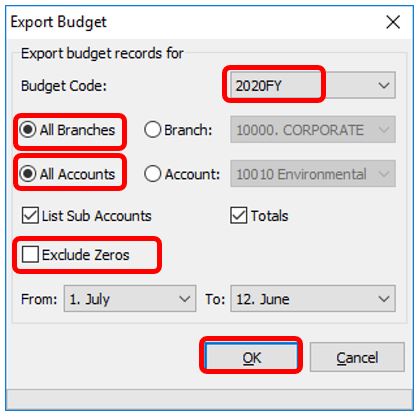 Select the budget code to export (the one created at step 1). Ensure “All Branches and “All Accounts” are ticked and “Exclude Zeros” is not ticked. Then Click “OK”.
