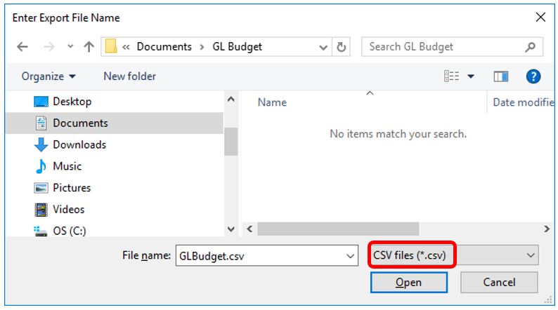 Choose where to save the budget export and the name. It must be saved as a csv file.