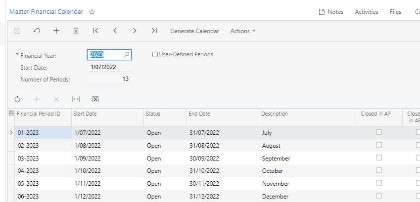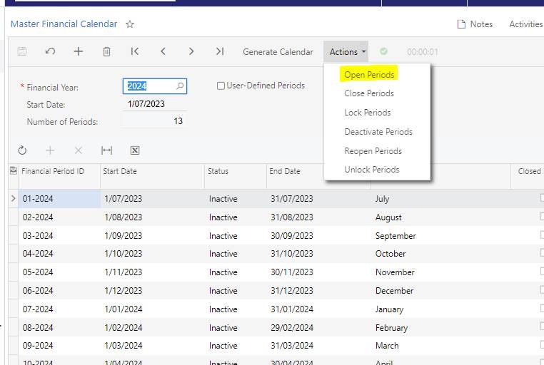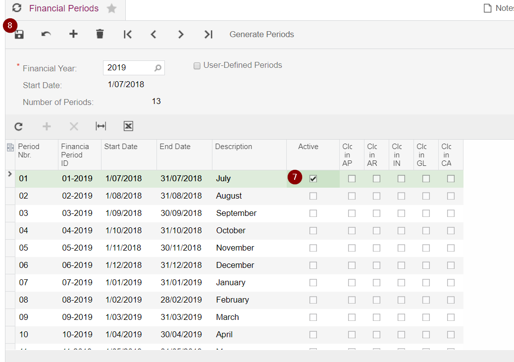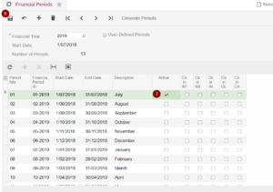 c) Once the financial periods are generated click on the Active box for the required month to be activated and then click “save”.